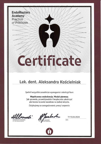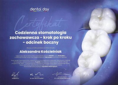 Ukończyła liczne kursy z zakresu stomatologii zachowawczej i endodoncji, m.in„Współczesna endodoncja – jak sprawnie, przewidywalnie i bezpiecznie zakończyć leczenie kanałowe na jednej wizycie” oraz „Codzienna stomatologia zachowawcza – odcinek boczny”. Szczególną satysfakcję daje jej odbudowa zębów z dbałością o anatomiczne detale – precyzyjne odtworzenie bruzd i guzków z użyciem narzędzi LM Arte, tak aby ząb był jak najbardziej zbliżony do swojej naturalnej formy.