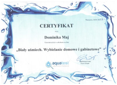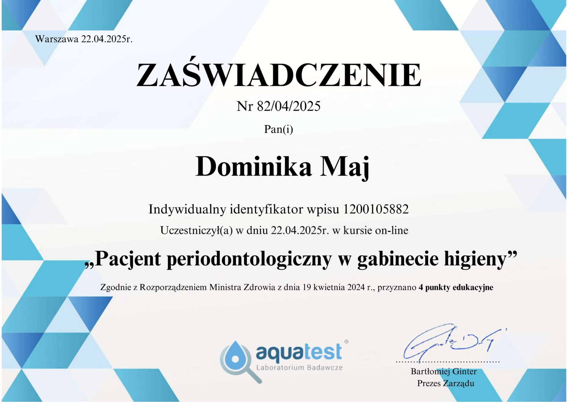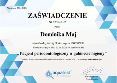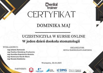 Dominika Maj jest dyplomowaną higienistką stomatologiczną, absolwentką kierunku higiena stomatologiczna na wydziale lekarsko-dentystycznym w Lublinie. W swojej pracy łączy precyzję, uważność i edukację pacjentów, traktując profilaktykę jako kluczowy element nowoczesnej opieki stomatologicznej.